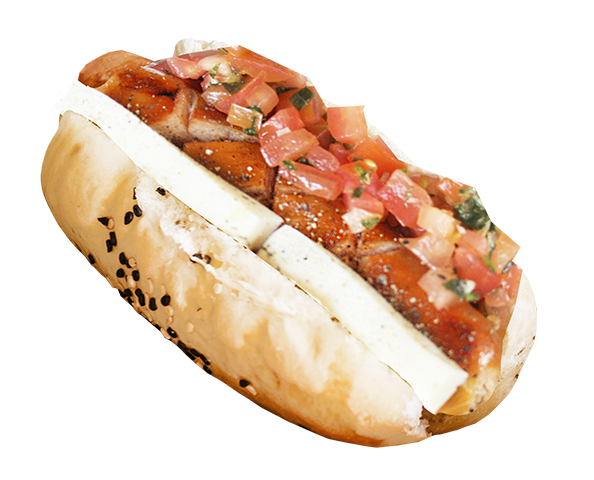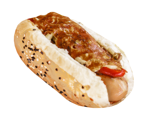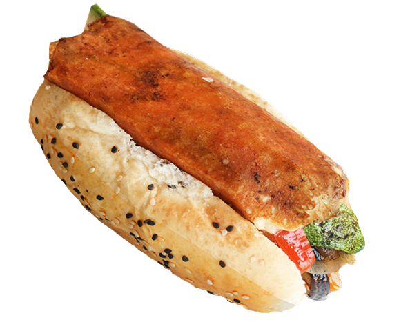 Calabacita, pimientos asados, berenjena y cebolla morada. Envuelto en queso Gouda crujiente.