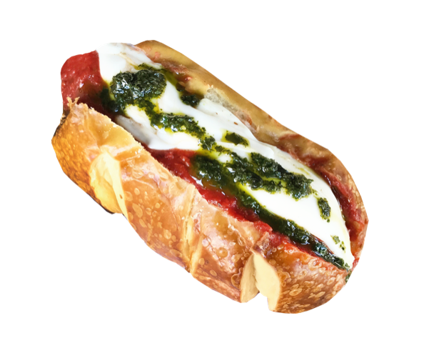 Salsa marinara, queso mozzarella y aceite de albahaca.